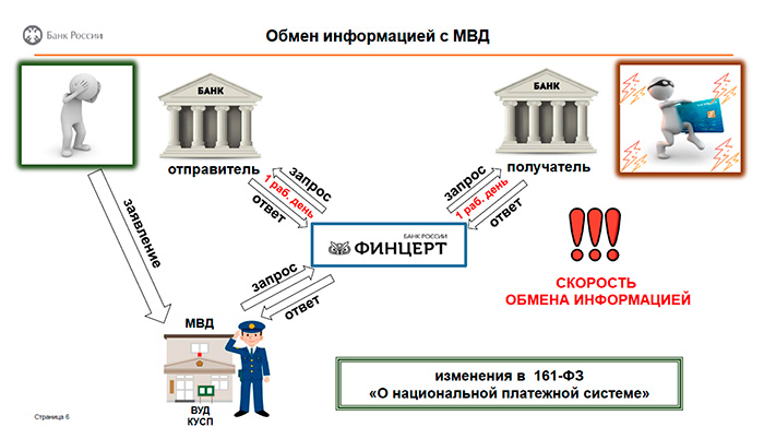 Что касается инициативы по информационному обмену с МВД, которая готовится к рассмотрению в рамках заседания правительства, в Банке России считают важным поддержать меры, направленные на повышение скорости и эффективности расследования уголовных дел по эпизодам мошенничества указанного типа. Правоохранительные органы тратят много времени на получение в кредитных организациях информации о счетах, через которые выводили похищаемые средства. В целях решения этой задачи разработаны предложения по организации на базе ФинЦЕРТ Банка России единого окна по оперативному (фактически в онлайн-режиме) взаимодействию с МВД. Предусматривается включение МВД России в перечень участников информационного обмена с ЦБ для получения (с соблюдением требований законодательства о банковской тайне) содержащейся в базе данных информации о случаях и попытках осуществления переводов денежных средств без согласия клиентов по возбужденным уголовным делам или по материалам органов дознания.